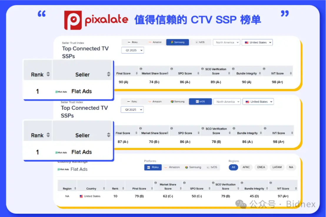 近日,全球领先的流量监测平台 Pixalate 发布了2025年第一季度"值得信赖的 CTV SSP"榜单。Bidnex 凭借在 Roku TV、Samsung TV+ 及 Apple TV 三大平台的卓越表现,成功跻身榜单前列,充分展现了在 CTV 领域的专业实力。
